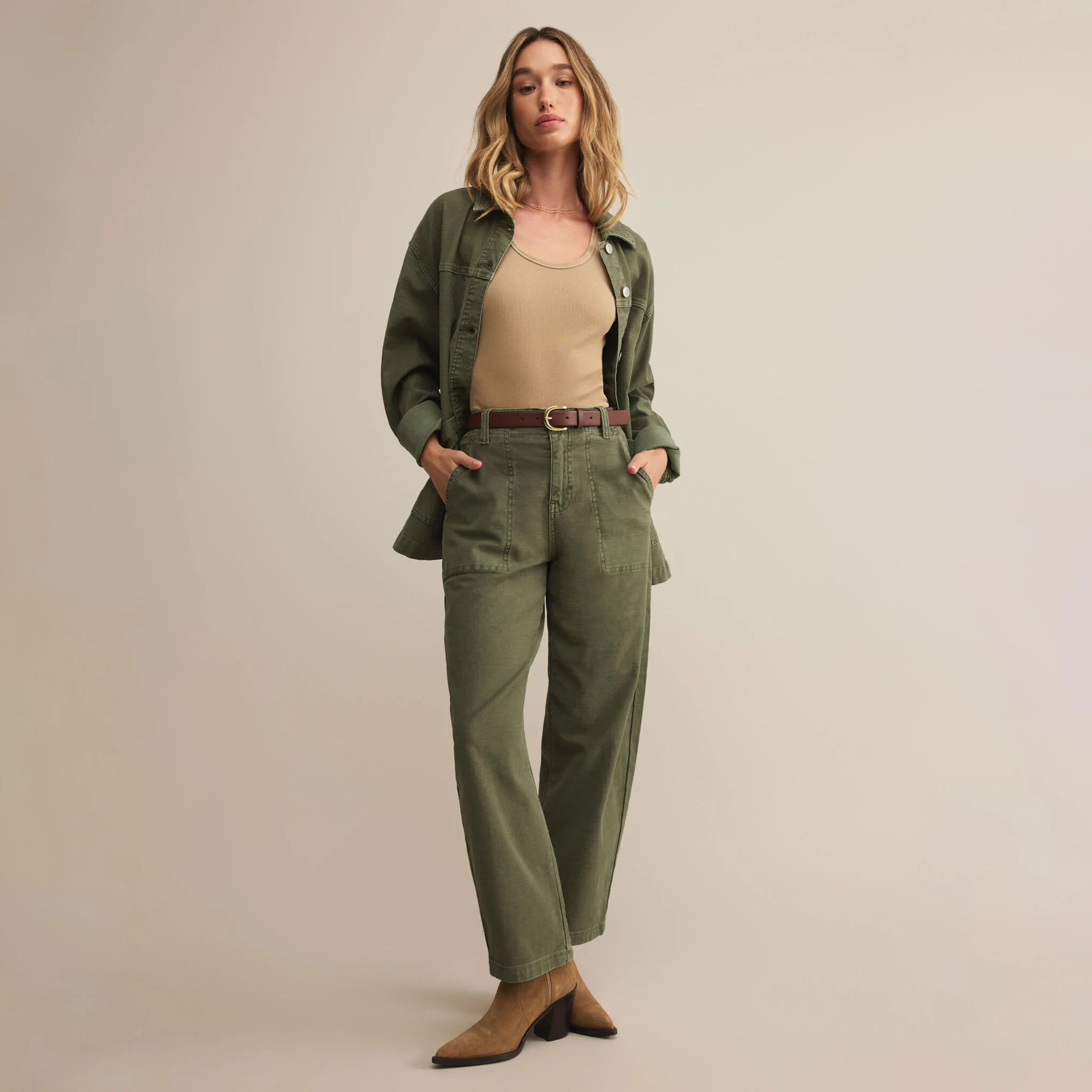 Step into comfort and style with the Z Supply Olive Twill Pants in Hunter Green. Featuring a high-rise fit and ankle-length barrel leg, these pants offer a flattering silhouette with a playful twist. Made from 100% cotton slub twill with a heavy soft wash, they feel wonderfully midweight and breathable. The zip fly with button closure and stitch pockets add both function and flair, while the 29" inseam keeps the look fresh and modern. Perfect for mixing and matching with your favorite tops for an effortlessly cool vibe.