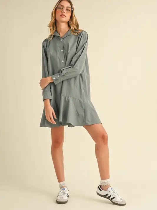 3/4 Sleeve Button Front Shirt Dress -- Black