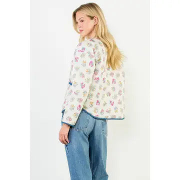 This floral pattern quilted jacket blends classic quilting with stylish floral design, elevated by durable denim trim for added structure. Snap buttons provide easy closure and a polished finish, making it a practical yet fashionable choice for layering in cooler weather.