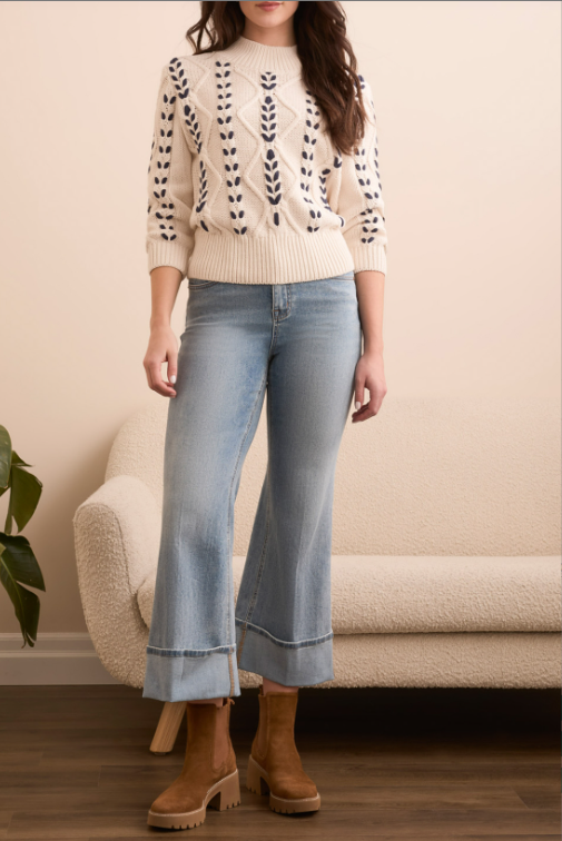 3/4 sleeve mock neck w/ cables -- Moonstone